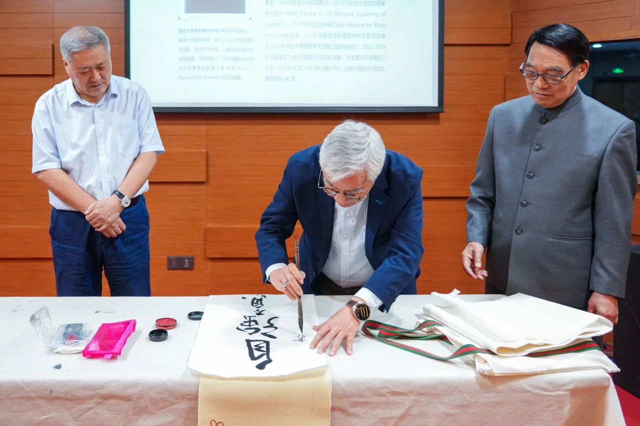 苏国辉院士挥毫赠与星空XK墨宝,胡军校长代表学校向苏国辉院士赠送刺绣。