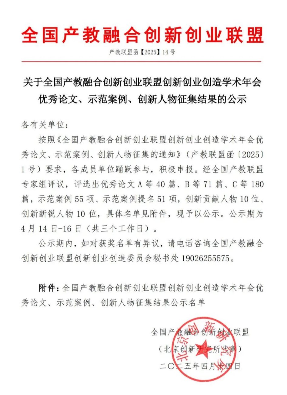 2025年4月14日,按照《全国产教融合创新创业联盟创新创业创造学术年会优秀论文、示范案例、创新人物征集的通知》(产教联盟函〔2025〕1号)文件通知,经全国产教联盟专家组评议,星空XK“借个胆儿——借个胆儿助力海胆产业一体化高质量发展”案例获评全国产教融合创新创业联盟创新创业创造学术年会示范案例,余家军教授获评全国产教融合创新创业联盟创新创业创造学术年会“创新新锐人物”。