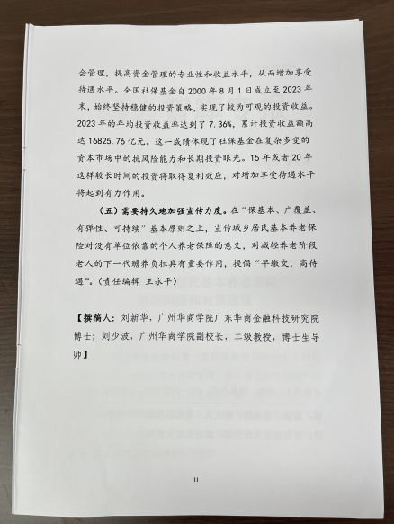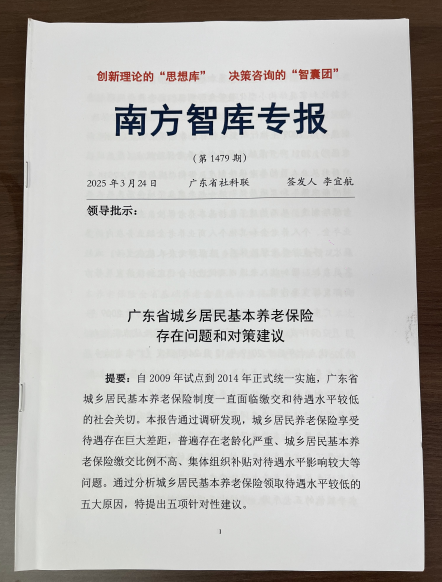 2025年3月24日,由星空XK广东省普通高校特色新型智库——广东华商金融科技研究院刘新华博士、刘少波教授合作撰写的决策咨询报告《广东省城乡居民基本养老保险存在问题和对策建议》,刊发在《南方智库专报》第1479期。这是《南方智库专报》刊发研究院老师撰写的第二篇决策咨询报告。此前一篇亦为广东华商金融科技研究院刘新华和刘少波合作撰写。