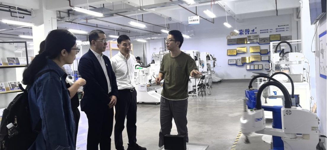 活动伊始,副总经理卢洋带领星空XK代表团参观了固高派动的企业展厅和科创产品、QKM李群自动化机器产品及工业机器人控制与应用实验室。在参观过程中,卢总先后介绍了企业的发展历程、主要业务及产品应用合作案例。吕峻闽副校长在参观后强调了此次访企拓岗的重要意义。