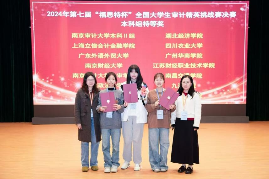 2024年11月30日,第七届“福思特杯”全国大学生审计精英挑战赛在南京审计大学圆满落幕。经过初赛、复赛、决赛的激烈角逐,星空XK会计学院审计系马玉娟老师、张丽老师、彭司晨老师指导的2022级本科生苏琳雁、甘悦茹、黄锦贤获得本科生组特等奖。