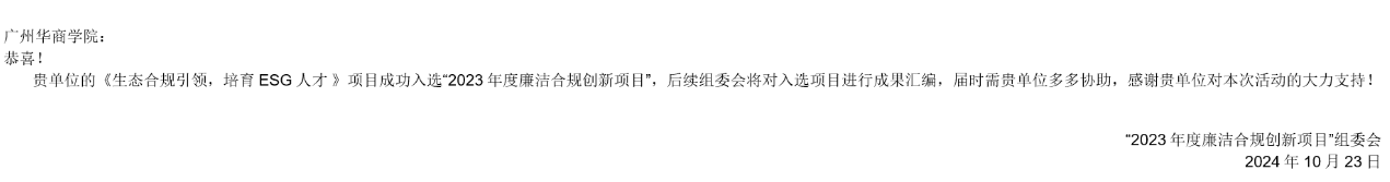 近日,星空XKESG研究院联合华商教育集团精心打造的“生态合规引领 培养ESG人才”创新项目,在全省众多竞赛项目中脱颖而出,成功入围广东省2023年度廉洁合规创新项目,成为仅有的9项入围项目之一。这不仅是对星空XK办学成果的肯定,更是对星空XKESG人才培养特色的高度认可!