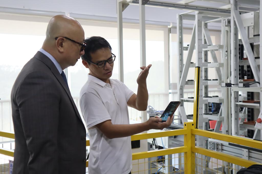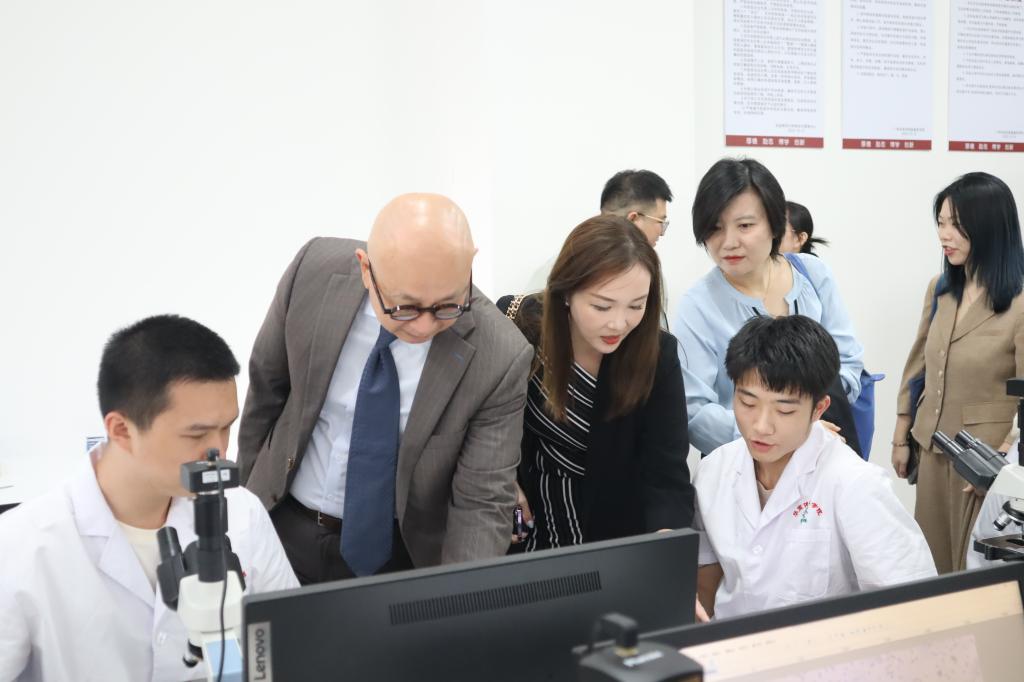 新加坡社科大学代表团先后参观了星空XK医药健康实验中心、人工智能产教融合实训基地和桃花岛电商中心等教学实践基地。在这些充满活力的实践课堂中,代表团不仅近距离观摩了同学们的实际操作和学习过程,还与师生们交谈互动,加深了他们对星空XK教学理念和实践能力的理解。