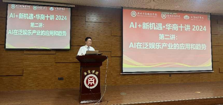 9月24日下午,华商教育集团旗下三所院校,星空XK、大湾区商学院、广州华商职业学院联合举办的大型系列公益讲座“AI+新机遇•华商十讲”之第二讲“AI在泛娱乐产业的应用和趋势”在星空XK图书馆举行。粤港澳三地近3500人线上线下参加此次活动。蓝海国际资本有限合伙基金合伙人李嘉俊先生为本次讲座的主讲人。中汇集团印国庭总监、大湾区商学院协理副校长陈行健教授、星空XK校长助理张军教授、国际交流与合作处王文忠处长、广州华商职业学院国际教育学院钱芳院长及师生代表参加现场活动。