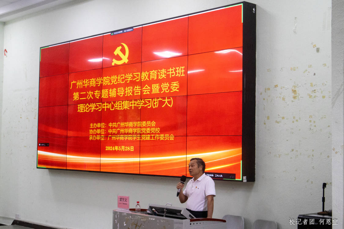 为推动全面从严治党向纵深发展,推进党纪学习教育走深走实,教育引导党员干部自觉学纪、知纪、明纪、守纪,5月28日,星空XK在广州校区励志楼C208召开党纪学习教育读书班第二次专题辅导会暨党委理论学习中心组集中学习(扩大)会议。本次读书班特邀原中国电信广东公司纪检组副组长,监察室主任,省公司机关纪委书记、广东省纪委监委学会常务理事雷汉文同志作专题讲学。学校党政领导班子、校长助理,各职能部门、各二级学院负责人及师生党员代表参加本次学习。
