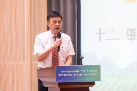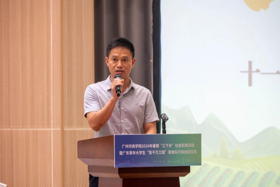 实践地干部代表黄田镇党委副书记、佛山市驻黄田镇帮镇扶村工作队队长梁柱发言。他回顾往年星空XK暑期“三下乡”社会实践取得的优异成果,并向今年参加社会实践活动的同学们提三点希望和要求:一是希望大家充分发挥专业优势,深入开展调查研究,为乡村振兴提供有力的支持。二是积极参与黄田镇的各项工作,深入群众,为他们解决实际困难和问题。三是希望大家严格遵守纪律,服从组织安排,注意安全,确保活动顺利进行。