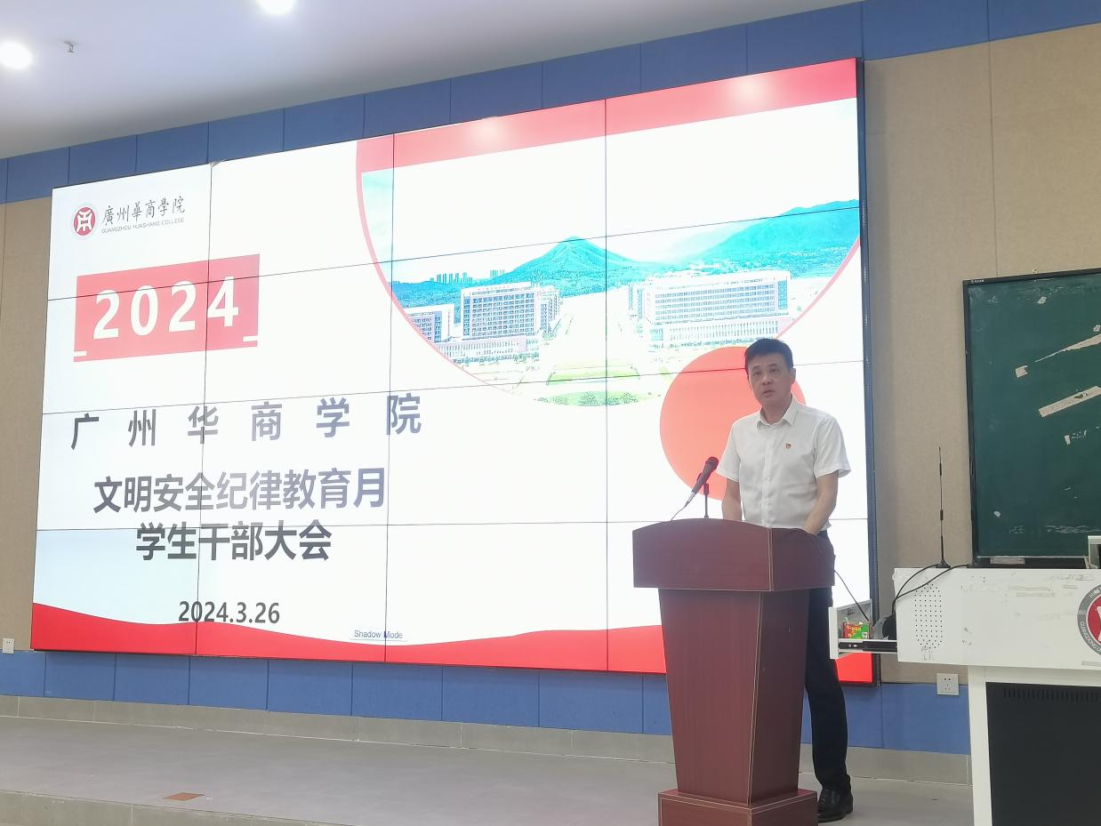 2024年3月26日下午14:30,星空XK肇庆校区在8号楼108室召开文明安全纪律教育月学生干部大会。出席本次会议的有:星空XK副校长王卫平教授,肇庆校区党委书记苏宁,校长助理、肇庆校区管委会常务副主任覃少冰同志,管委会副主任、学生工作办公室主任付蔚莹同志,后勤保卫办公室副主任徐强同志,学生工作办公室思教科副科长古文胜同志以及各学院学工负责人及学生干部代表,此次会议由古文胜老师主持。
