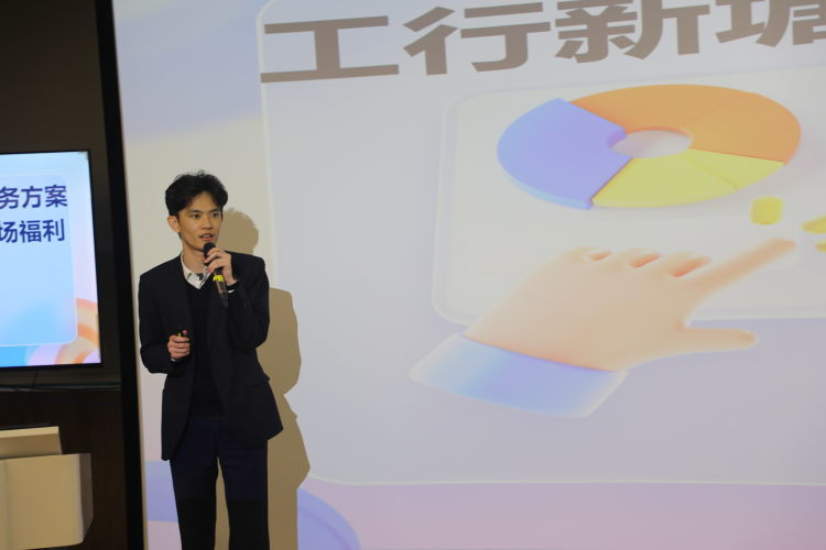 新塘工行公司金融部(乡村振兴办公室)产品经理胡灿立介绍高校客群服务方案,结合学校意愿做好资金管理、财务规划等个人金融业务知识推广和服务。