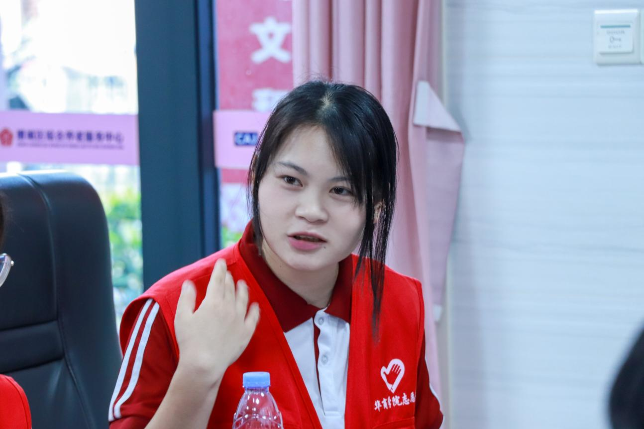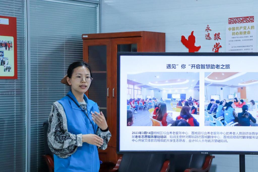 介绍“智慧助老”项目服务情况。广州慈爱嘉养老服务中心葛芳芳主任介绍到,2023年3月至12月,星空XK“智慧助老”项目开展以来,近200名华商青年志愿者在增城区两个社区参与助老、敬老志愿服务,服务长者500余人,在实践中彰显华商学子的责任担当。活动中,在中心工作人员指导下,华商志愿者采用一对一或集体授课的形式,开展智能手机班、化妆班、中医养生、手工绘画等课程,为社区老人带来新知识、新活力、新体验。