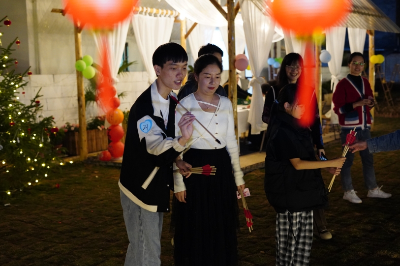 敬老院活动结束后,青年职工们前往秋田花花参加跨年联谊活动。联谊活动中,青年职工们通过男女搭配的方式,踊跃参与了“EMOJI答题”“摸盲盒”“游园投壶”“飞盘保龄球”“放烟花”等游戏。游戏展示了来自多个不同单位青年职工的风采,缓解了工作压力,增进了青年职工之间的沟通,为单身青年职工们搭建了交流的平台。
