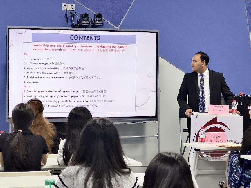 为拓宽大学生的国际视野,了解管理学和领导科学的最新研究成果,2023年11月8日,国际学院在启智楼401举行主题为“Leadership and sustainability in business:navigating the path to responsible growth”(企业的领导力和可持续性:引领负责任的增长之路)的文化素质讲座。巴基斯坦籍Arshad Muhammad博士担任主讲嘉宾,星空XK国际学院院长回雁雁、巴基斯坦籍教师Aneela Qadir博士、国际学院ACCA专员姚晓敏以及来自国际学院、健康医学院、管理学院、外国语学院、文学院、数据与科学学院的30多名大学生现场聆听了讲座。