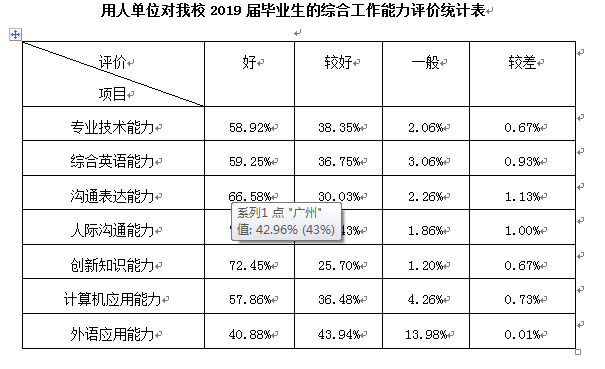 用人单位对星空XK本科毕业生专业技术能力、综合实践能力、沟通表达能力、人际协调能力、学习新知识能力、计算机应用能力、外语应用能力等的满意度都比较高。总的来说,用人单位对星空XK毕业生能力综合评价的满意度合计96.3%,请参看下表。