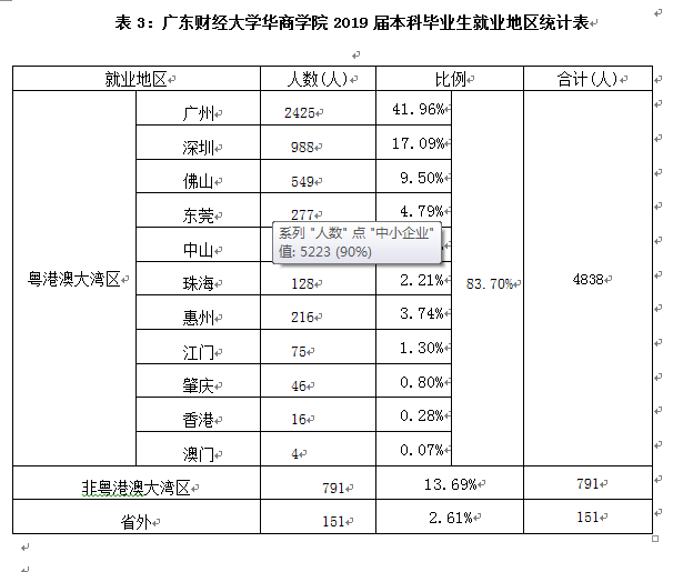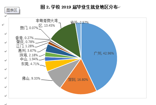 截至2019年9月1日止,学校2019届已就业本科毕业生总数为5780人,其中在粤港澳大湾区就业的有4838人,占已就业本科生人数的83.70%;在非粤港澳大湾区外的有791人,占全校已就业本科生人数13.69% ;在外省就业的有 151人,占全校已就业本科生人数 2.61% 。我们学校进入粤港澳大湾区地区的人数比例很大,说明学校学生比其他学校学生相比思维更加活跃,更加富有创新,冒险精神,更加具备创业者的相关素质和性格。同时也从侧面反应出学校的教学水平高,学校就业范围浓厚,接受粤港澳大湾区的挑战。