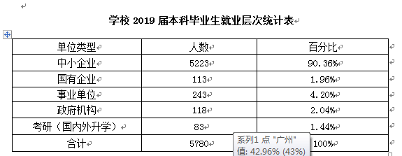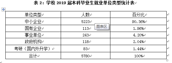 学校人才培养的目标是为广东中小企业及社会服务机构培养理论基础厚,实践能力强、综合素质高的高级应用型人才。从就业流向来看,学校2019届毕业生主要集中在中小型企业就业。学校的就业单位类型统计情况请参看表2和图1。