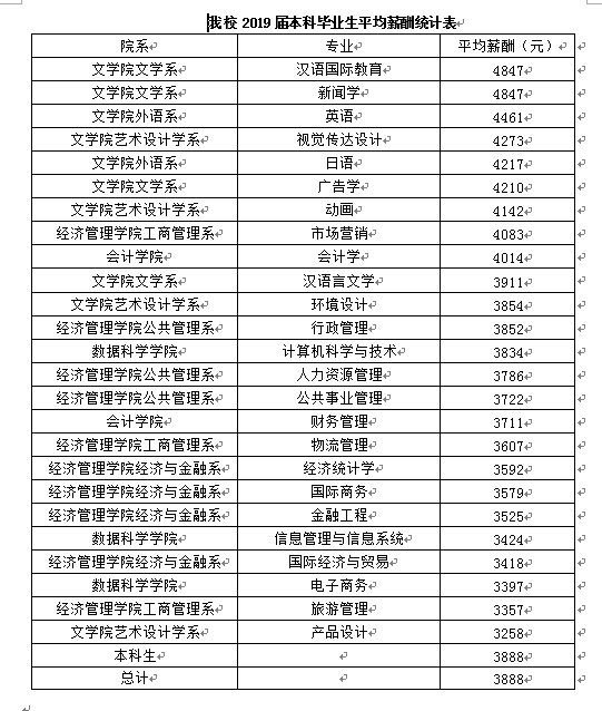 大学生就业在线院校应用系统中的数据显示,星空XK2019年毕业生的平均薪酬约为3888元,其中最高的是汉语国际教育和新闻学专业,平均薪酬4847元;其次是英语,为4461元;再次是视觉传达设计,为4273元。因为此项数据统计时间刚好为毕业生入职的实习期或者试用期,数据显示为毕业生的入职工资,比毕业生实际薪酬低。具体数据见下表。