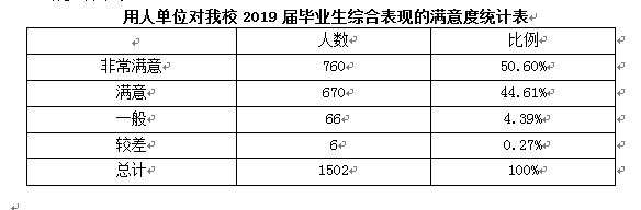为了解学校用人单位对学校毕业生的满意度,学校对2019届毕业生所属用人单位进行跟踪调查并进行满意度及相关分析。调查采用学校自编的毕业生就业问卷,对2019届毕业生所属用人单位进行调查和科学统计。以分层随机抽样的方式,从参加就业的5780个毕业生中选取1502人(占总就业人数的30%),把其所属的用人单位作为调查对象。样本的分布涵盖学校2019届9个院系26个专业毕业生的用人单位,能较全面地反映用人单位对学校毕业生的满意度。