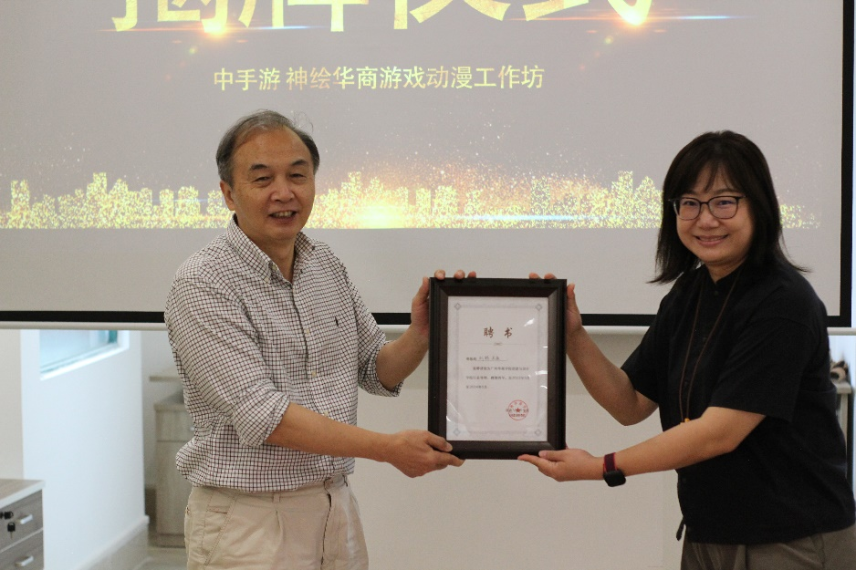 为促进双方合作与实践教学,星空XK创意与设计学院聘请中手游神绘公司总经理骆俊、美术总监刘畅担任 “行业导师”,王列耀副校长为其颁发聘书。