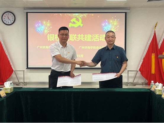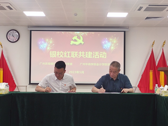 2023年5月26日,会计学院党委和广州农商银行增城支行(简称“农商行增城支行”)党委在合汇广场增城农商行总部进行红联共建主题活动及签约仪式。本次活动是根据学习贯彻习近平新时代中国特色社会主义思想主题教育的要求,结合共建双方实际,实现资源共享、优势互补、互助共建,促进党建与业务发展“同频共振”,开展“校银携手,合作共赢”为主题的红联共建工作。广州农商银行增城支行党委副书记兼纪委书记赵明、党委委员兼行长助理谢超颖、党委委员兼零售业务部经理田春雷,星空XK会计学院党委副书记陈洋广、党委委员兼副院长周书域、学工办副主任兼党支部书记杨烨瀚等一行出席活动。农商行增城支行部门经理、员工党员代表,会计学院部分党支部书记、20名学生党员代表共同参加本次活动。